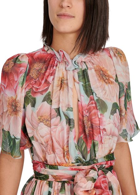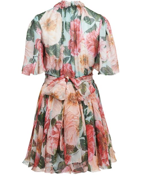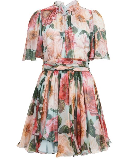 This Acqua Camelia mini dress is designed by Dolce & Gabbana. It is very cool and floaty and elegantly combines puff sleeves, a flared cut and a cinched waist, all with a floral print.