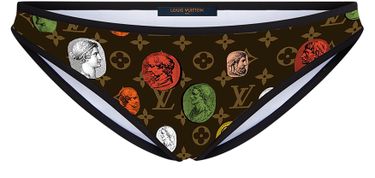 Low-rise jersey bikini bottoms refreshed with a playful spin on the House’s iconic Monogram motif. A vibrant selection of Ancient Greek and Roman cameos and coins from the Fornasetti archive add a pop of color to the print, framed by contrast black trimming. A sporty, signature swimwear essential.