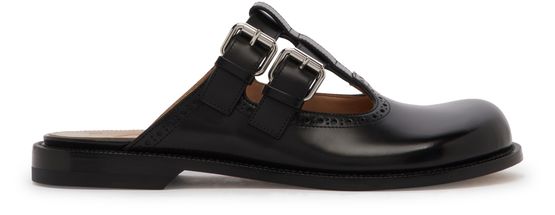 Loewe's Campo Mary Jane mules feature a round toe, buckled strap, closed design, logo-printed insole, and low heel.