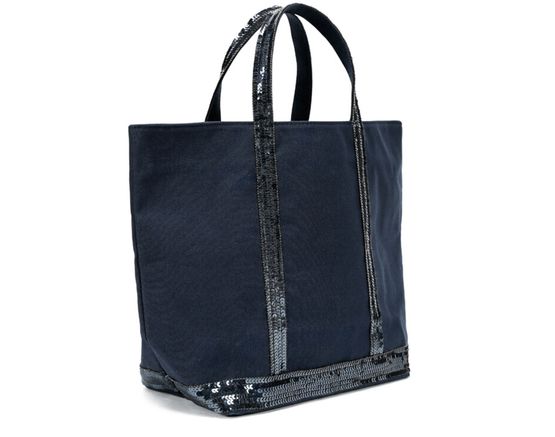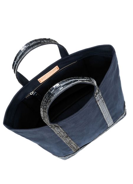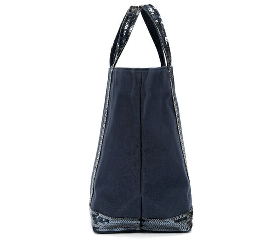 Cotton canvas cabas tote bag highly durable and waterproof, topped with sequins. This is the standard size for this model of tote bag and can be carried only at hand. It has an inside zipped pocket, which is topped off with a label of natural vegetable leather hot stamped with "Le Cabas Vanessa Bruno made in France".