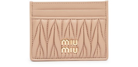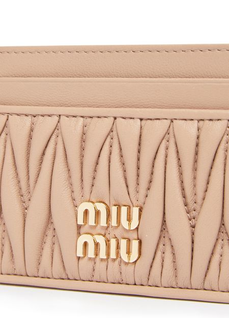 Miu Miu's Matelassé nappa leather card holder features a luxurious padded texture and a front logo in gold letters. This sleek and compact accessory is perfect for storing your essential cards and cash in style. Ideal for adding a touch of sophistication to your everyday essentials.