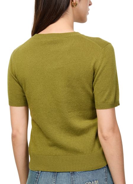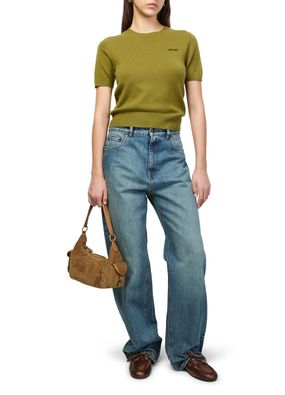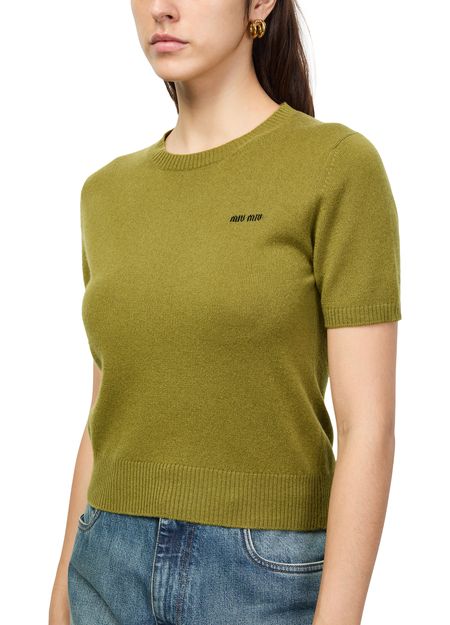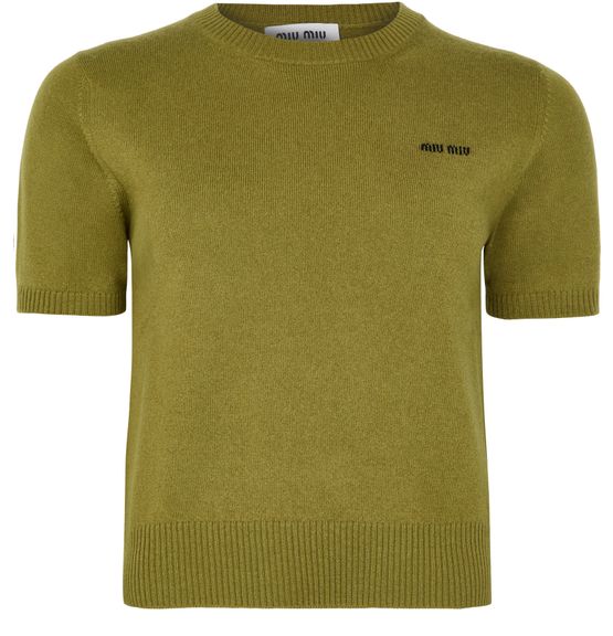 Reveal Miu Miu's cashmere t-shirt, featuring a refined crew neck and short sleeves for a modern silhouette. The embroidered "Miu Miu" logo on the chest adds a signature touch, making this top a versatile choice for both casual and elevated ensembles.