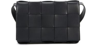 Bottega Veneta's Cassette Bag is a textured leather bag with an adjustable strap, rectangular shape, and a zippered interior pocket. It features the brand's signature orthogonal weaving and a magnetic closure. This versatile bag can be worn in the hand or on the shoulder, making it a stylish and functional accessory.