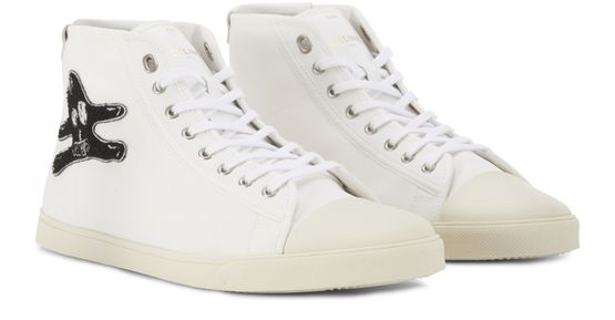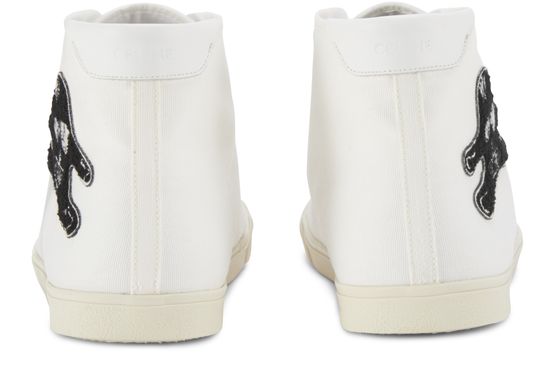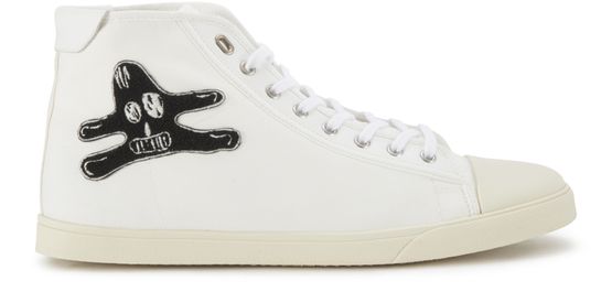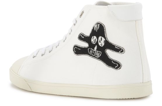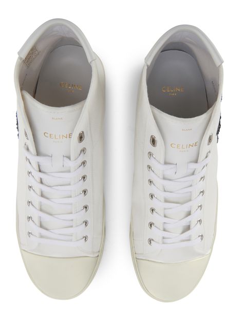 These high-top Celine Blank sneakers are part of a collaboration with German painter André Butzer. These lace-up shoes feature a contrasting rounded toe. The flexibility of canvas is combined with the luxury of calfskin leather in this design. These high-top sneakers are enhanced by a figure created by André Butzer and sewn on the side of the foot.