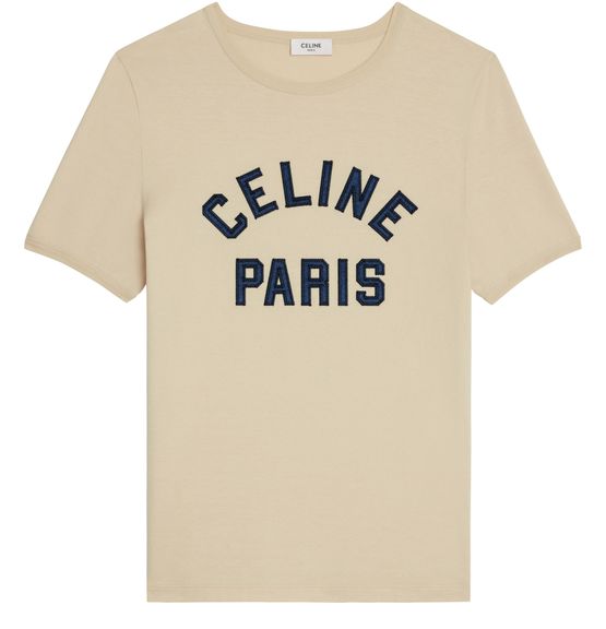 Celine's Paris 70s cotton jersey t-shirt embodies effortless style with its classic fit and crew neck design. Crafted from 100% cotton, it features short sleeves and a ribbed trim that enhances its charm. An embroidered Celine Paris patch adds a touch of sophistication, making it a must-have piece made in France.
