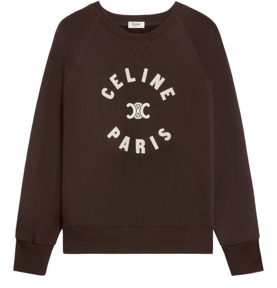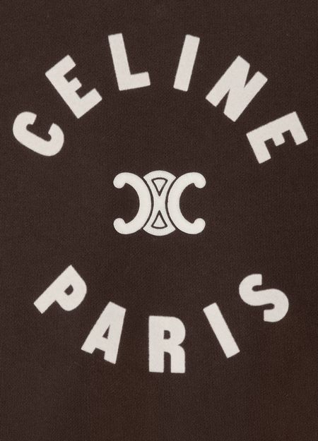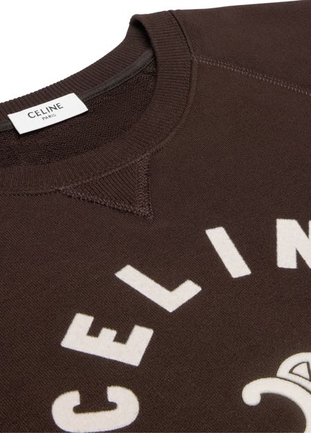 Celine's Triomphe sweatshirt embodies effortless Parisian chic. Crafted from soft cotton fleece, it features a distinctive Triomphe patch and elegant flocking. With its classic fit, crew neck, and long raglan sleeves, this piece is perfect for casual outings. The kangaroo pocket and ribbed trim add a refined touch, making it a must-have.