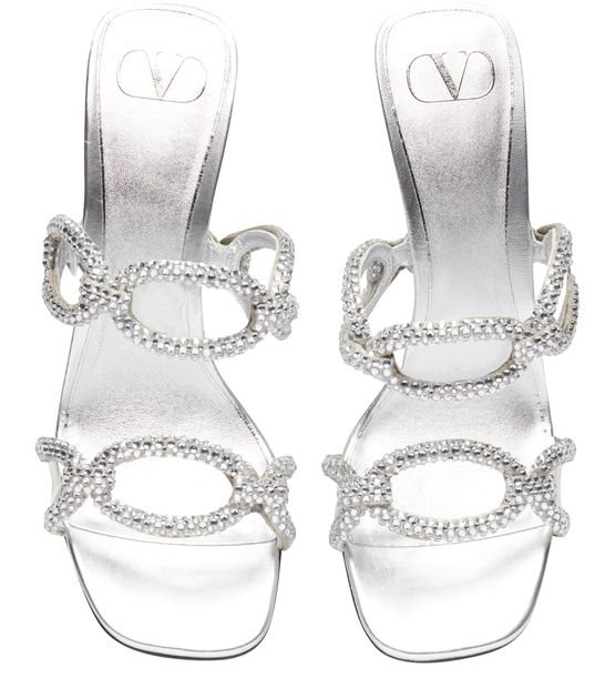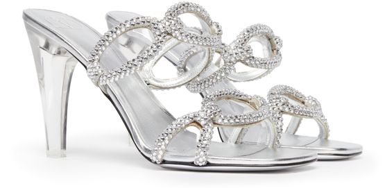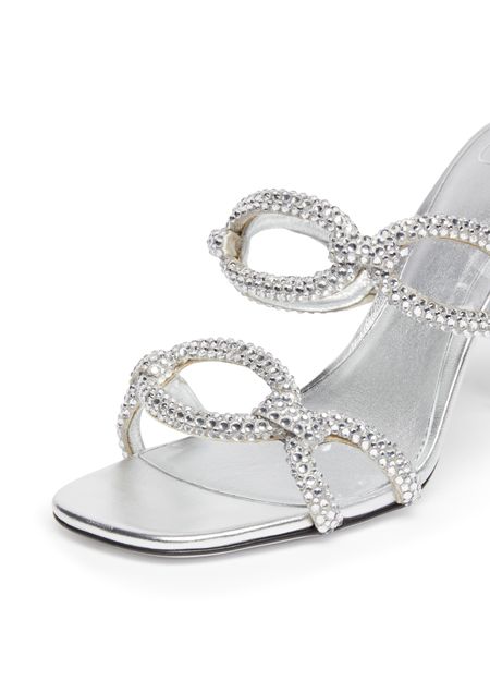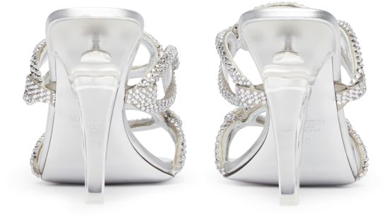 • Description : logo in silver letters, stiletto heel, open square toe, logo-printed insole, silver finish, high heel, crystal-embellished strap.