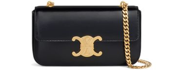 Celine's Triomphe shoulder bag in shiny calfskin is a statement of elegance. Adorned with metal hardware finishing, it features a striking Triomphe metallic closure. The chain handle offers a stylish shoulder carry option, while the inner flat pocket adds practicality. This bag effortlessly combines luxury and functionality for any occasion.