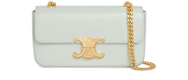 Celine's Triomphe shoulder bag in shiny calfskin is a statement of elegance. Adorned with metal hardware finishing, it features a striking Triomphe metallic closure. The chain handle offers a stylish shoulder carry option, while the inner flat pocket adds practicality. This bag effortlessly combines luxury and functionality for any occasion.