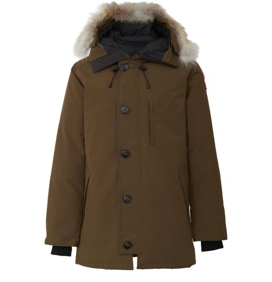Château Parka is a hooded jacket with a straight, wide cut and a mockneck design. It features fur detail, long sleeves with cuffs, and side welt pockets. The jacket has a button and concealed zip fastening and falls to mid-thigh length. It is designed to resist temperatures ranging from -10°C to -20°C with a centre back strap bearing the "Canada Goose" label.