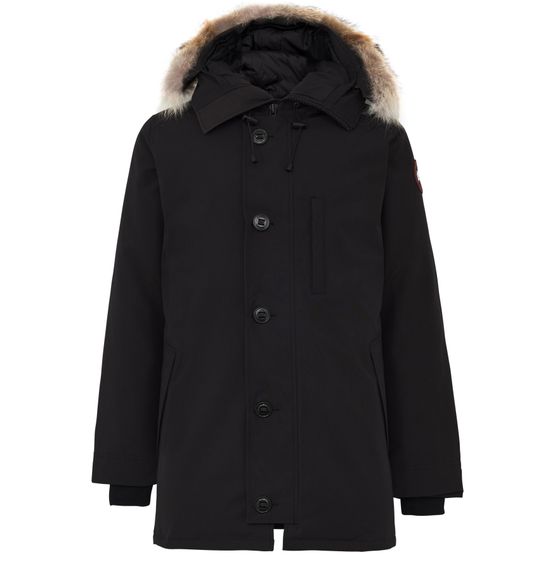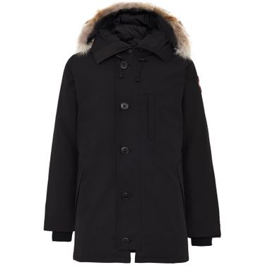 Château Parka is a hooded jacket with a straight, wide cut and a mockneck design. It features fur detail, long sleeves with cuffs, and side welt pockets. The jacket has a button and concealed zip fastening and falls to mid-thigh length. It is designed to resist temperatures ranging from -10°C to -20°C with a centre back strap bearing the "Canada Goose" label.