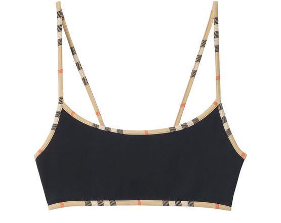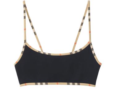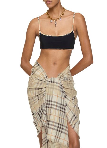 Reveal Burberry's check bikini top, defined by its rectangular neckline and delicate bow fastening. The refined silhouette and thin shoulder straps offer a modern edge, making it perfect for sun-soaked escapes or poolside relaxation. Experience effortless style with this standout piece from Burberry.