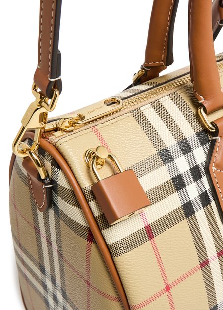 Embrace Burberry's Check bowling bag, a statement piece that combines functionality with style. Featuring the iconic Burberry Check pattern, this shoulder bag is crafted with precision, showcasing contrast stitching and a gold finish. The detachable strap and double handles offer versatile carrying options, while the zipper closure ensures your essentials stay secure.
