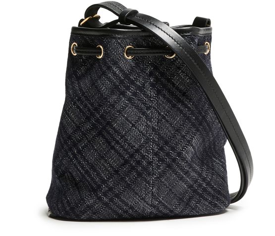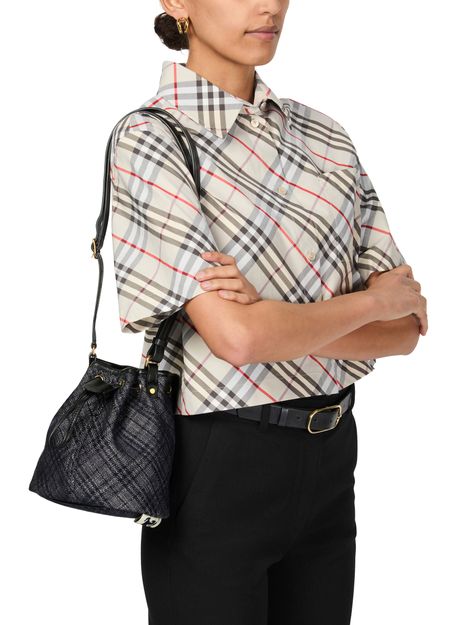 Reveal the Burberry Check mini bucket bag, a sophisticated blend of iconic style and functionality. Featuring a distinctive Burberry Check pattern and a thin strap, this small bucket bag is elegantly finished with a gold touch. The drawstring closure adds practical elegance, making it an essential accessory.
