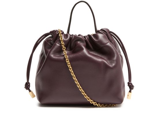 Reveal Chloe's Icons bucket bag, crafted from smooth leather with a single handle and chain strap for versatile styling. Gold-finish hardware and a front logo in gold letters add refined detail, while the spacious interior and drawstring closure ensure both elegance and practicality.