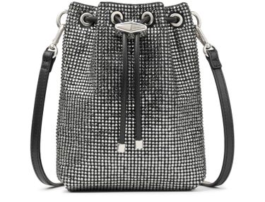 Jimmy Choo's Cinch Mini bucket bag is a stylish accessory with a unique design. It features a single compartment secured by a drawstring closure, complemented by a removable and adjustable chain shoulder strap. Its silver finishes, engraved logo, and playful pompom details enhance its elegance, making it perfect for hand or shoulder carry.