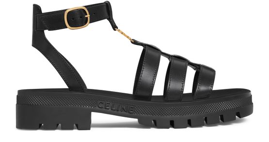 Step into luxury with Celine's Clea Triomphe gladiator chunky calfskin sandals. Featuring striking Triomphe hardware with a gold finish, these sandals boast an adjustable buckle for a perfect fit. The leather insole and chunky lug rubber outsole with a diamond pattern ensure comfort and style, while Celine's signature embossed details elevate every step. Made in Italy, these sandals are a true statement of elegance and...