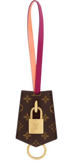 The eye-catching Cloche Clé LV Padlock bag charm is the ideal accessory for adding a refined, colorful accent to a handbag or set of keys. Its slim strap and keybell, crafted in top-quality leather, are adorned with a finely detailed LV signature padlock in gold-toned metal. The Monogram motif adds an extra House touch.