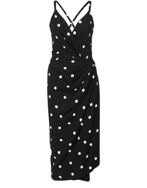 This daring asymmetric cocktail dress features a polka dot design draped at the waist for a modern and extremely elegant look designed by Dolce & Gabbana.