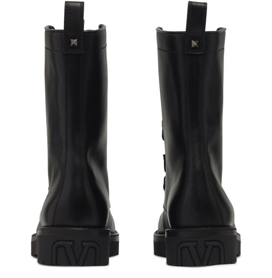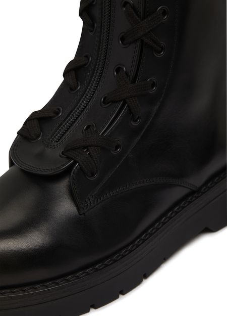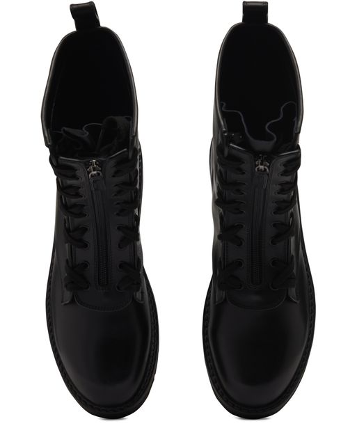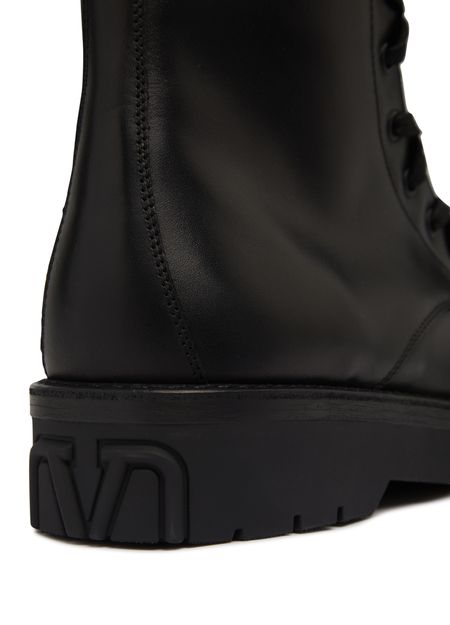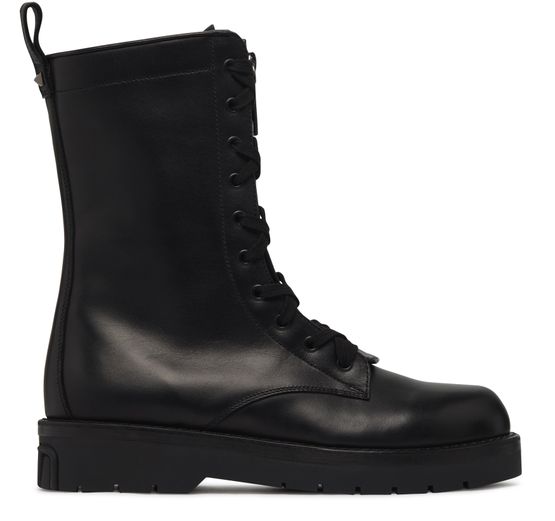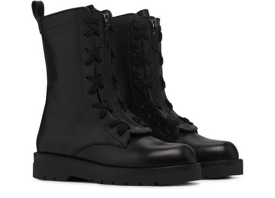 Combat boots feature a high-top upper with a notched sole and flat heel for stylish comfort. They are designed with a zippered closure and contrast details, showcasing the brand's embossed logo. Additionally, a convenient loop at the back allows for easy slipping on and off.