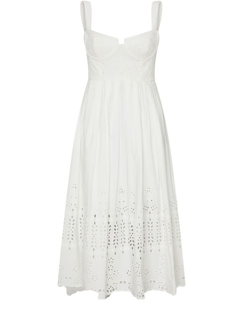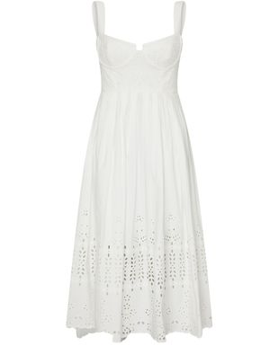 Self Portrait's Cotton broderie midi dress showcases an elegant a-line cut that flatters every silhouette. With delicate shoulder straps and a chic rectangular neckline, it exudes timeless sophistication. The back zipper closure adds a modern touch, making it the perfect choice for both casual outings and special occasions.
