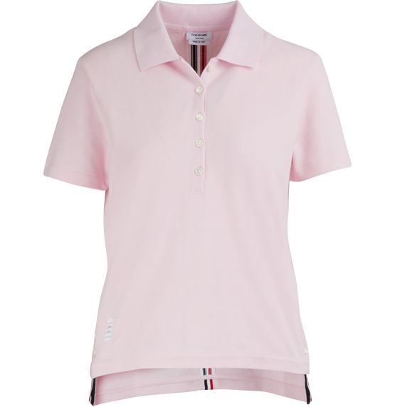 This polo shirt with back stripe from Thom Browne revisits an American fashion classic. This essential is adorned with a tricolor stripe mid-back and a label that is subtly sewn into the front hem. Pair it with dark draped pants and sandals for a sophisticated look with sporty accents.
