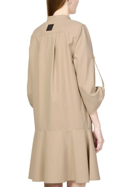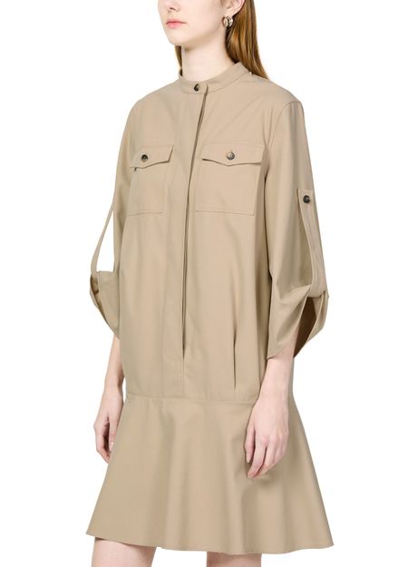 • Description : high-neck, front buttoned closure, visible stitching, mandarin collar, tiered dress, shirt dress, two front pockets, flap pockets, three-quarter-sleeved, appliquéd logo.