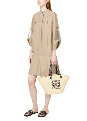 Loewe's Cotton tunic dress showcases a high-neck and mandarin collar, complemented by a front buttoned closure. This tiered midi dress features three-quarter sleeves, two flap pockets, and visible stitching for a refined touch. The appliquéd logo adds a subtle charm, making it a versatile shirt dress for any occasion.