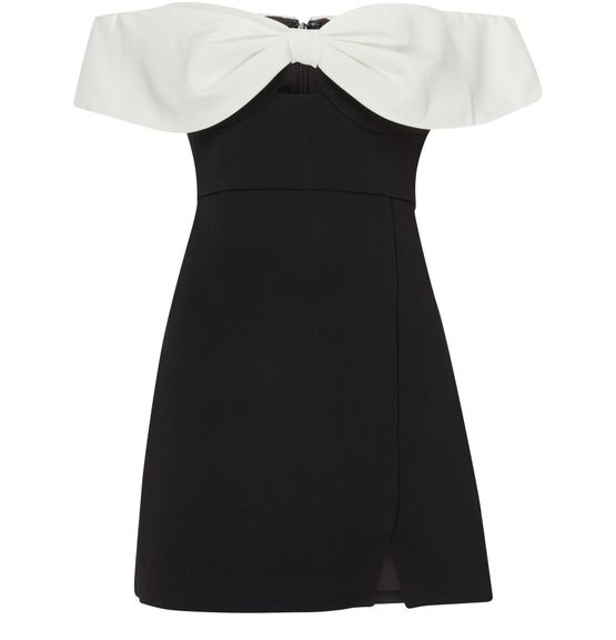 Self Portrait's Crepe bow mini dress showcases a chic silhouette with short sleeves and a daring bare shoulder design. Its back zipper closure ensures a snug fit, while the front left slit adds a touch of allure. Perfect for evening outings, this dress effortlessly blends sophistication with playful charm.