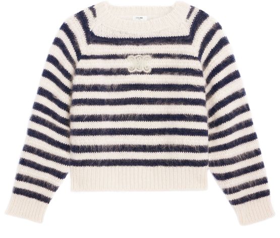Celine's Crew neck marinière sweater in mohair and silk embodies effortless elegance. With its loose fit and ribbed trim, it drapes beautifully, while the Triomphe embroidery adds a touch of sophistication. Made in Italy, this sweater is perfect for stylish layering, making it a must-have for any fashion enthusiast.