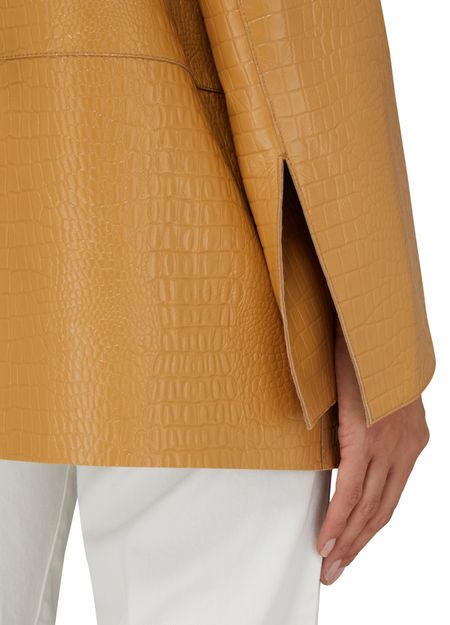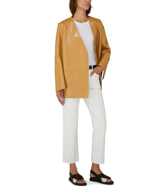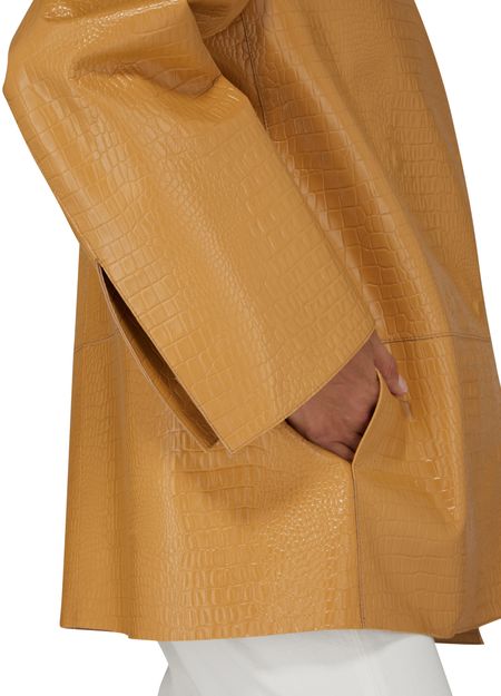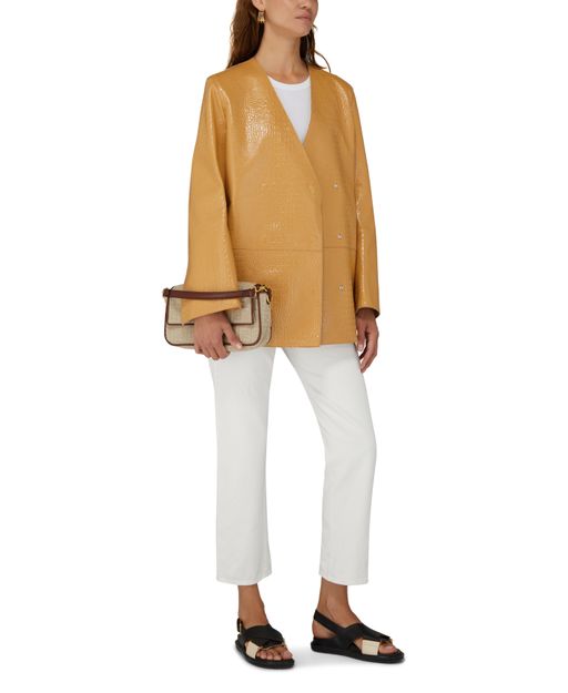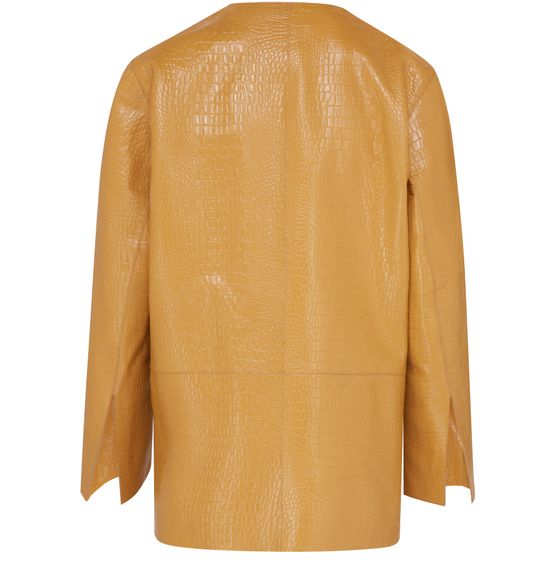 Croco Embossed Leather Blazer is a collarless jacket crafted from luxurious crocodile-embossed leather. With its straight, wide cut and V-neck design, it exudes sophistication and elegance. The long sleeves provide added versatility, while the wrap fastening with press studs adds a contemporary touch to this timeless piece.
