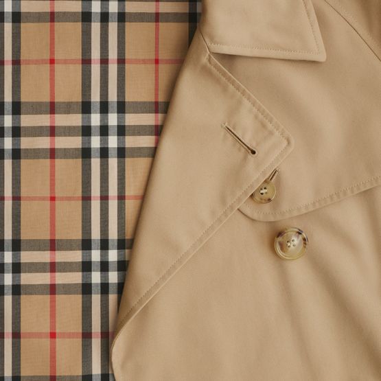• Description : Burberry Check, short, notched collar, long-sleeved, patch pockets, flap pockets, double-breasted, topstitched edges.