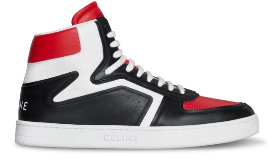 Celine's Ct-01 "z" trainer high top sneaker in calfskin combines sporty elegance with modern design. Its round toe shape features thin perforations on the upper and striking side trimmings with graphic lines. Celine's signature adorns the back and tongue, while the embossed nomenclature adds a refined touch, making it a standout choice for any fashion-forward individual.