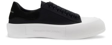 Alexander McQueen's flat wedge sole deck sneakers feature a modern and edgy design with contrast details. The shoes have a logo on the ankle, adding a signature touch. These stylish sneakers are perfect for a casual and effortless look, providing both comfort and style for everyday wear.
