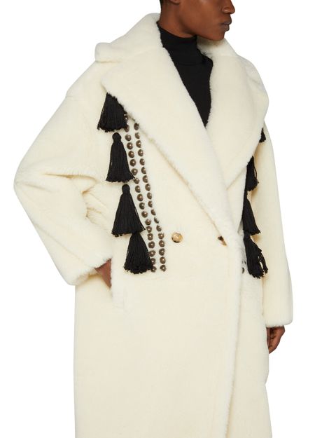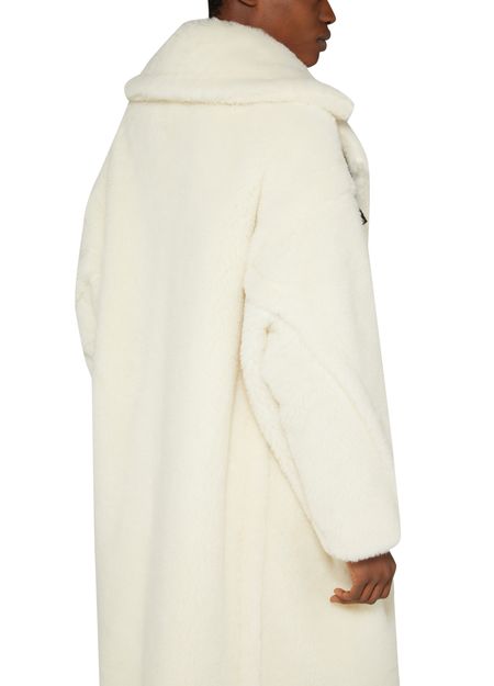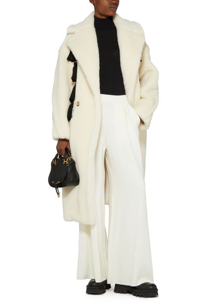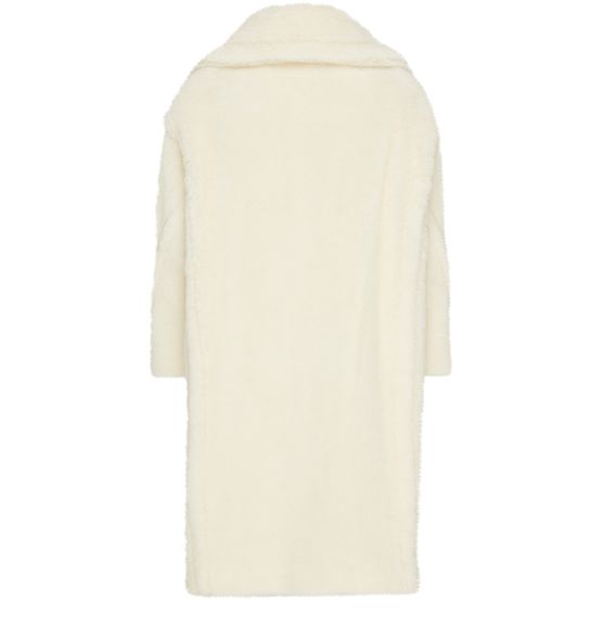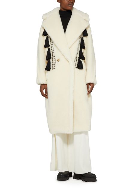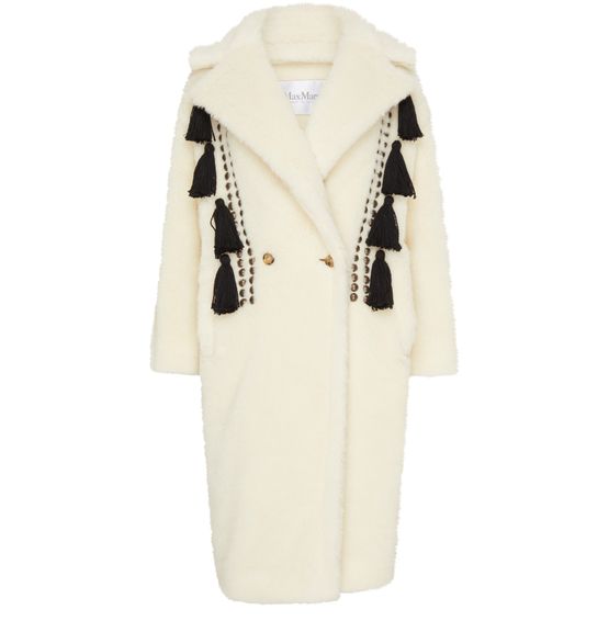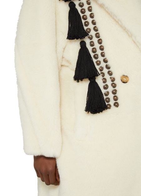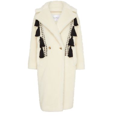 Max Mara's Demetra Teddy coat is a sophisticated knee-length outerwear piece with side pockets and fringe details. It features a single-breasted design with 2 buttons, long sleeves, and a notched collar for a classic look. This coat is perfect for adding a touch of elegance to any outfit.