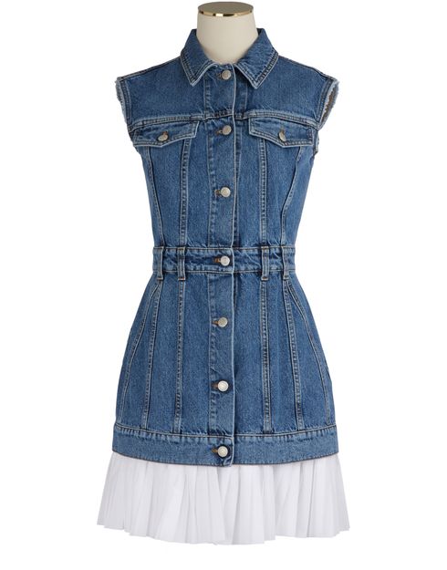 The must-have denim dress is reinvented here in the iconic Alexander McQueen style. The brand draws inspiration from the traditional sleeveless denim jacket that it elongates, all while cinching the waist. In the Victorian spirit that influenced the collections of the founding designer, this piece features a contrasting delicate and immaculate petticoat on the bottom.