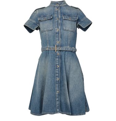 McQueen's denim dress showcases a flared silhouette with a front buttoned closure and short sleeves. The visible stitching adds a touch of detail, while the breast pocket and flap pockets enhance its functionality. This mini dress combines classic shirt collar elements with modern style, perfect for any occasion.