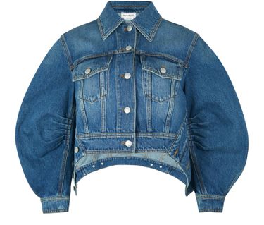 This denim jacket is a sophisticated piece by Alexander McQueen. The brand unveils a piece with a bold cut, shorter at the front and featuring balloon sleeves.