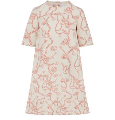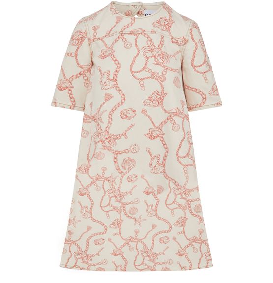 • Description : Short dress, flared cut, short sleeves, snap-button fastening, graphic print.