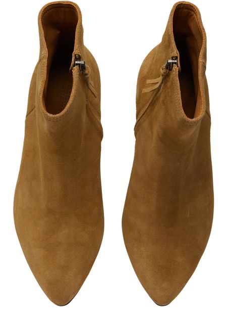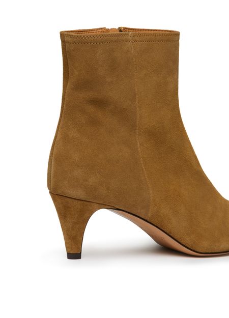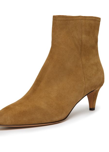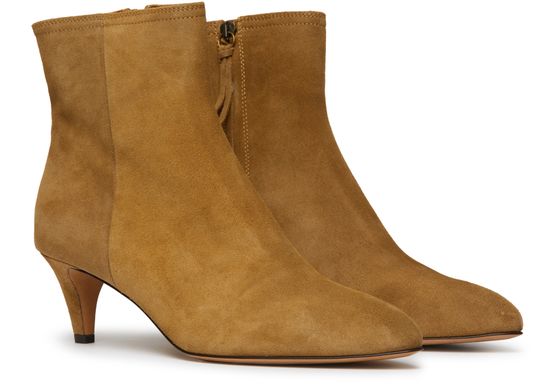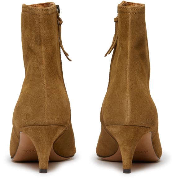 The Isabel Marrant Deone ankle boots are a stylish addition to any wardrobe. Made from soft suede, these boots feature a high-top upper and a unique heel design. The pointed toe and topstitched edges add a touch of sophistication to these versatile boots.