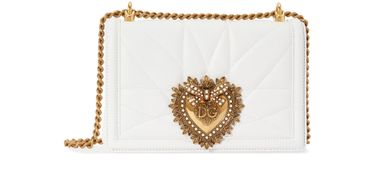 As stunning as a jewellery box, the Devotion shoulder bag features an elegant design with a glittering heart. The combination of materials and details are artfully highlighted by Dolce and Gabbana.