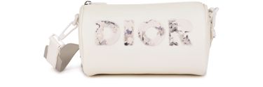The white roller bag is part of the DIOR AND DANIEL ARSHAM artist collaboration. The artist's unique interpretation of Dior’s traditional logo featuring a distressed texture, is showcased on the front of the piece. The cylindrical design has a single interior compartment, which makes the piece convenient for holding everyday essentials such as a wallet, phone, earphones, and more.