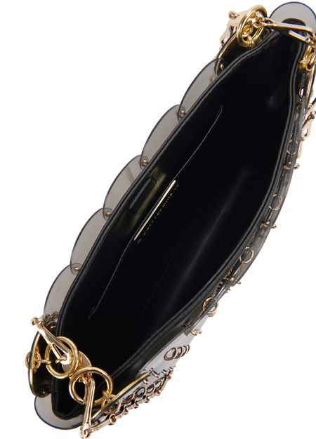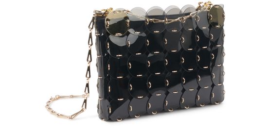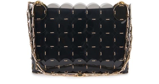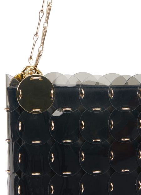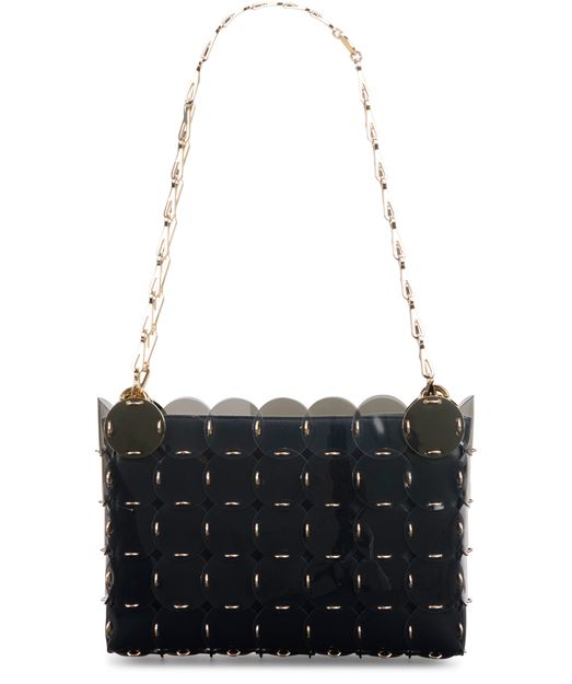 Worn on the shoulder for even more sophistication, this Disc bag by Paco Rabanne features a chain shoulder strap and an evanescent design formed by discs held together by gold joints.