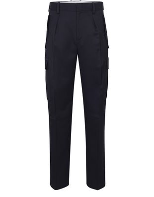 These double-hemmed cargo pants are by JW Anderson. This wool and cotton piece is characterized by a loose fit and multiple exterior pockets.