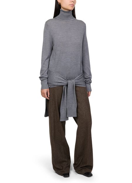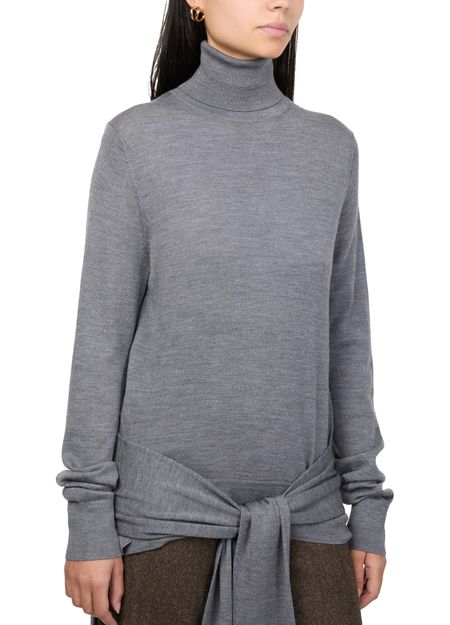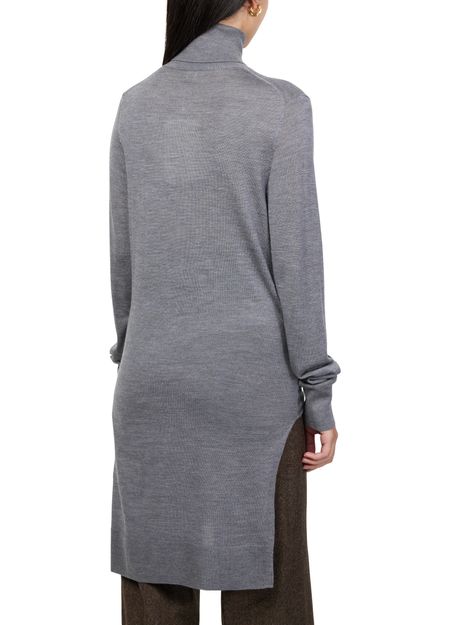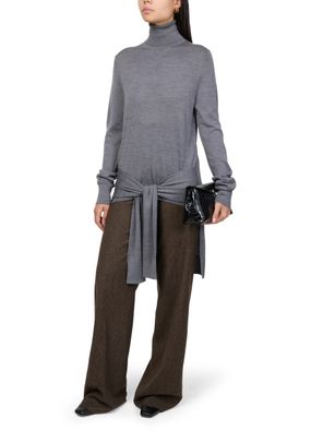 Reveal Toteme's double-sleeve turtleneck sweater, a masterpiece in knitwear. This long, ribbed piece features a marled texture, offering a modern twist with its shorter front design. The long sleeves and turtleneck create a sleek silhouette, perfect for versatile styling across various occasions.