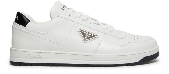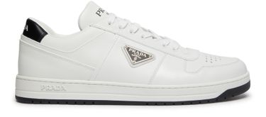 Prada's Downtown sneakers showcase a sleek lace-up design crafted from smooth leather, complemented by micro-perforated fabric for breathability. The thick outer sole provides durability and comfort, while the logo on the tongue adds a touch of sophistication. Perfect for urban explorers seeking style without sacrificing functionality.