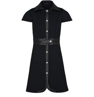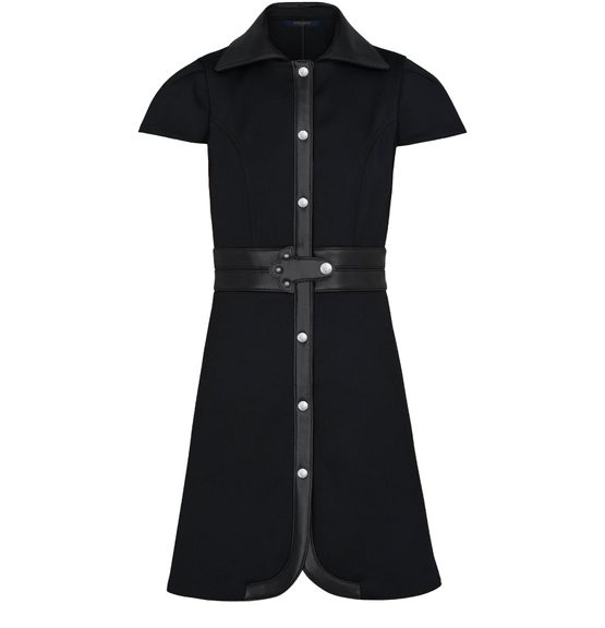 With LV-signed buttons and a delicately crafted palm-shaped leather buckle, the short-sleeved Dress With Leather Inserts combines signature detailing with this season's key shape. Made from luxury stretch wool, this piece complements the silhouette with a figure-hugging style. It is finished with petal-shaped edging at the hem and a wide collar in supple leather.