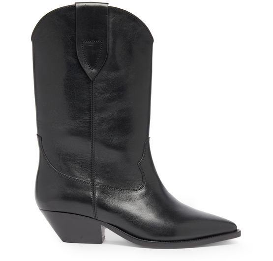 Isabel Marant's Duerto ankle boots showcase a high-top upper with a sleek pointed toe. Crafted with visible stitching, these western boots feature a stylish beveled heel and a low heel for comfort. Perfect for any occasion, they effortlessly blend elegance and edge, making a statement with every step.