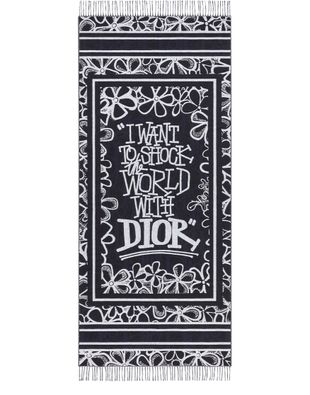 The blue scarf was created in collaboration with Shawn Stussy. Crafted in wool and cashmere jacquard, it features an all-over floral pattern with a subtle Dior Oblique jacquard motif, fringed edges, and is embellished with the quote 'I want to shock the world with Dior'. This graphic scarf will lend a finishing touch to any look.