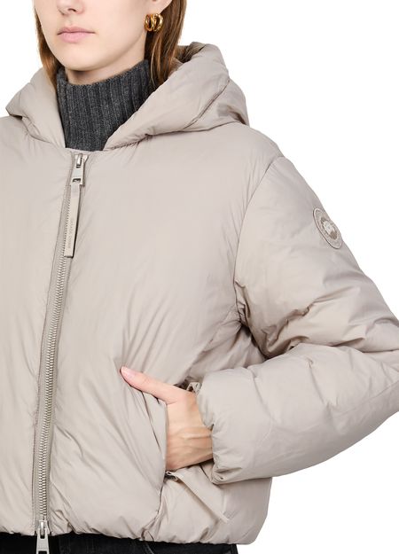 Introducing Canada Goose's Elba aviator jacket, a regular fit puffer jacket that combines style and warmth. This short, long-sleeved piece features a zipper closure and padded texture, crafted from warm fabric. Perfect for versatile styling, it transitions effortlessly from casual to formal occasions.